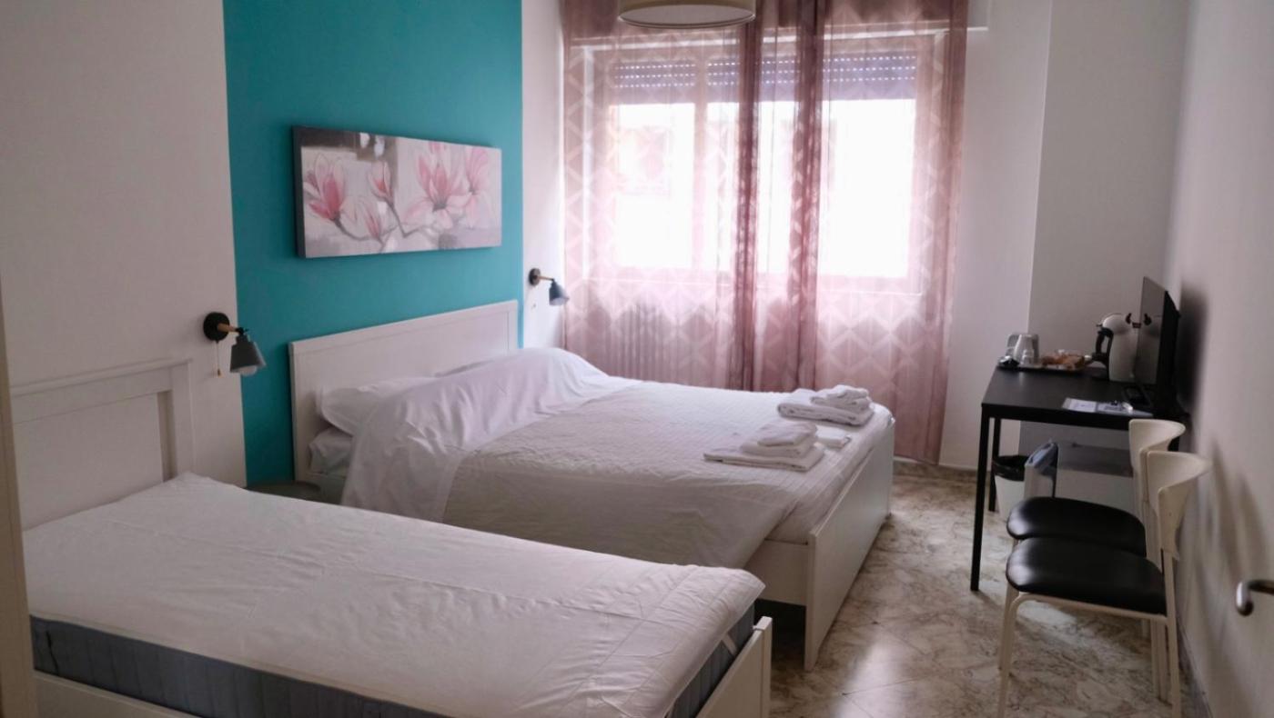 Camera Tripla con Bagno in Comune. Providing free toiletries, this triple room includes a shared bathroom with a shower, a bidet and a hairdryer. The triple room provides a tea and coffee maker, a wardrobe, a tiled floor, a flat-screen TV, as well as city views. The unit offers 2 beds. ;