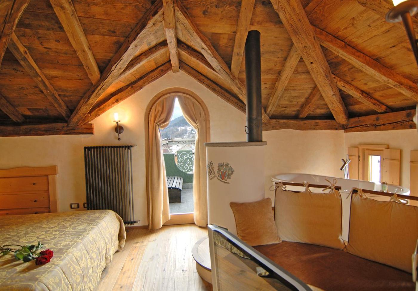 Suite con Terrazza - Su 2 Livelli. Suite molto ampia su 2 piani con vista a 360 gradi su Bormio dalla terrazza privata. Il piano inferiore ospita un soggiorno, mentre la camera da letto si trova al piano superiore. Il bagno include una doccia idromassaggio e una vasca. ;
