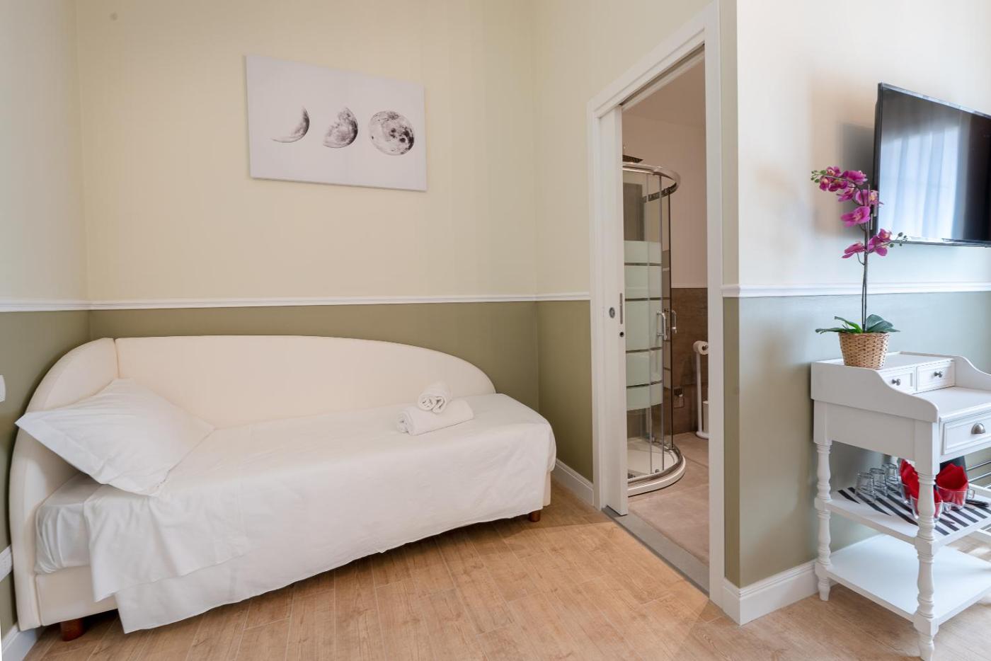 Camera MatrimonialeDoppia con Letti Singoli. Camera matrimonialedoppia con letti singoli dotata di bagno privato con doccia, bidet, asciugacapelli edi cortesia. Camera matrimonialedoppia con letti singoli dotata di aria condizionata, TV a schermo piatto con canali satellitari, minibar,per la preparazione di tè e caffè, armadio e vista sul cortile interno. L’alloggio dispone di 1 letto. ;