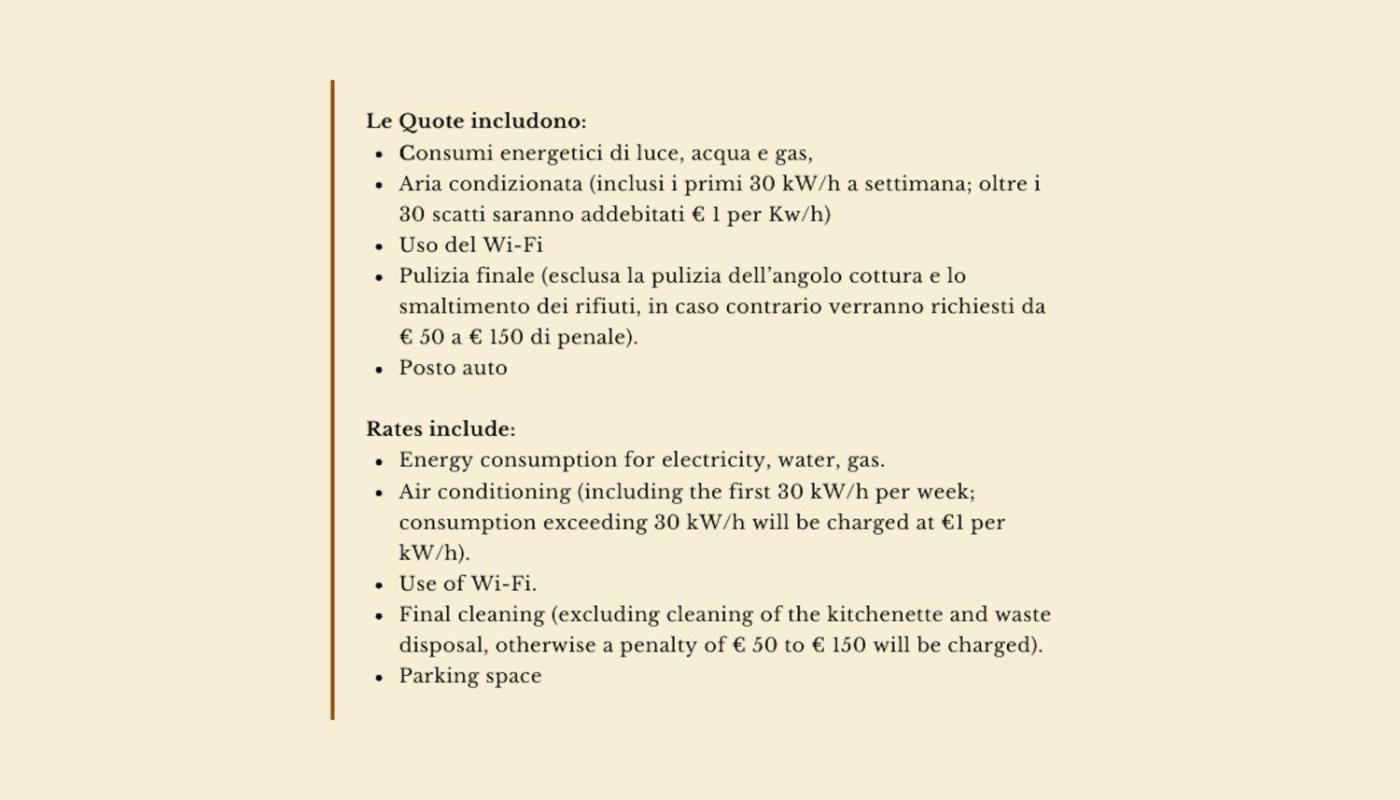 Please note that the use of air conditioning is included in the price for up to 30 kWh, and excess consumption will incur an additional charge of EUR 1 per kWh.
