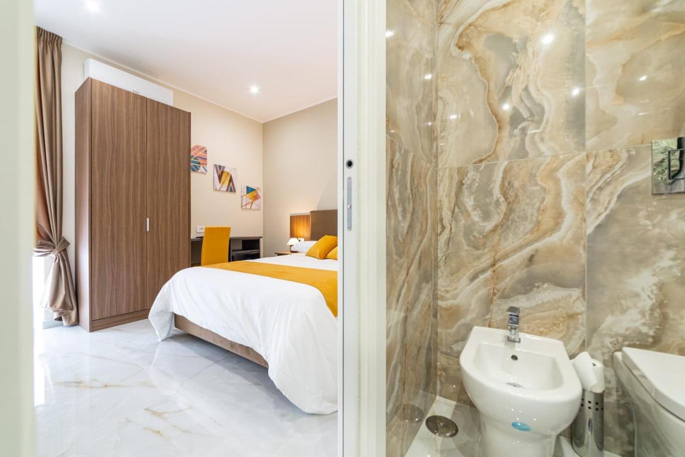 Camera Matrimoniale con Bagno Privato. Camera matrimoniale dotata di bagno privato con doccia, bidet, asciugacapelli edi cortesia. La sistemazione dispone di aria condizionata, minibar,per la preparazione di tè e caffè, armadio, TV via cavo a schermo piatto e vista città . L’alloggio presenta 1 letto. ;