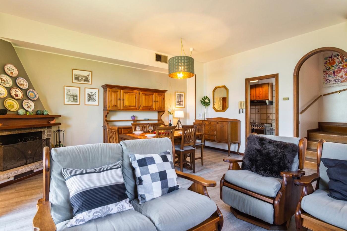 Casa con 2 Camere da Letto su 3 Piani. This semi-detached house is on 3 floors and features a private garden with parking area. It offers panoramic lake views. WiFi is free. The house has a kitchen and lake-view living room with fireplace at ground floor, while upstairs there are 2 bedrooms, a balcony and bathroom. The basement hosts a laundry area, an extra bathroom, and a tavern with table tennis. ;