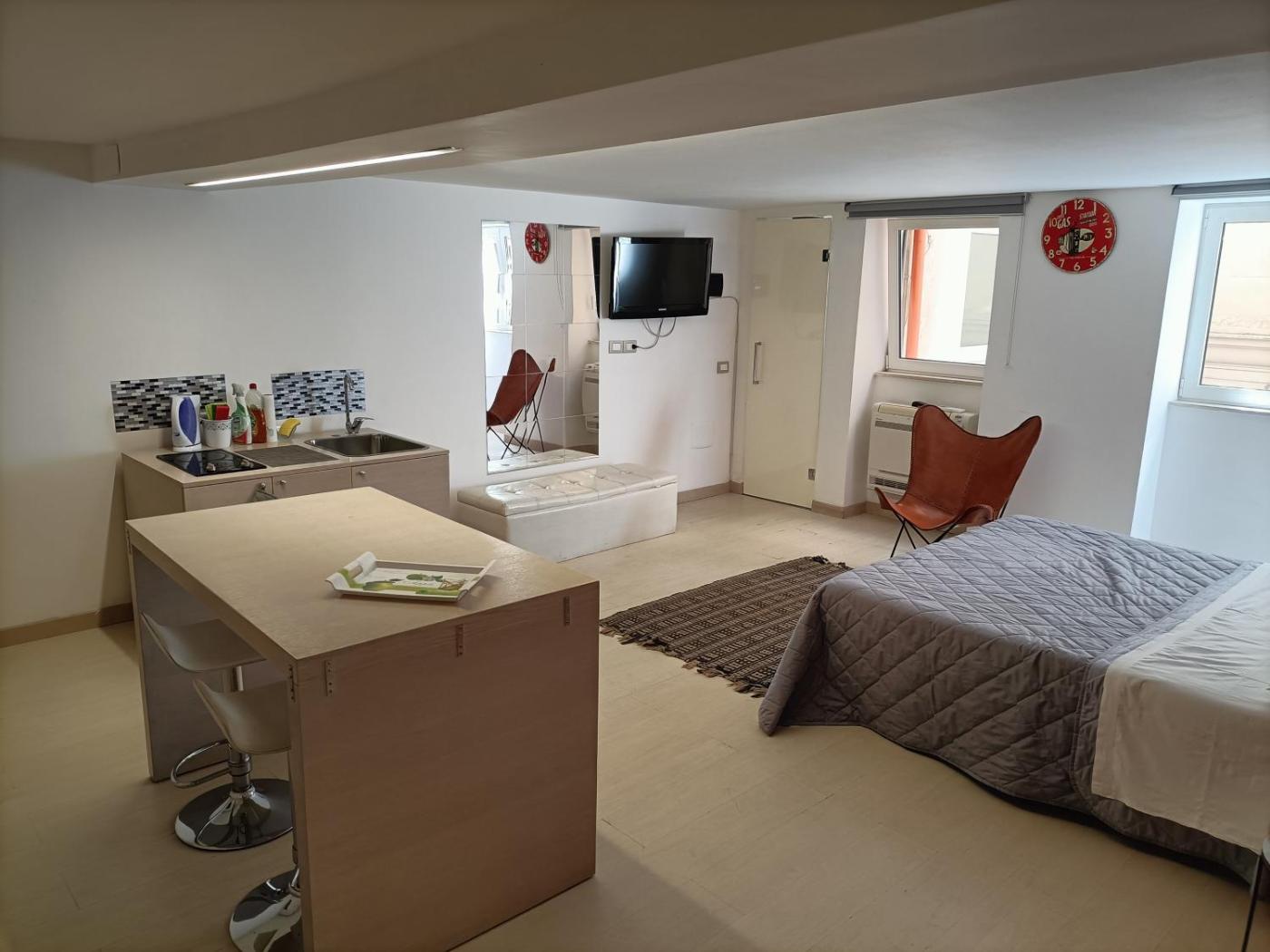 Loft. Appartamento composto da 1 soggiorno, 1 camera da letto separata e 1 bagno con doccia a filo pavimento edi cortesia. L’angolo cottura è ben attrezzato con fornelli, frigorifero, forno a microonde e utensili da cucina. L’unità abitativa è dotata di aria condizionata, TV a schermo piatto, lavatrice, armadio e bollitore elettrico. L’alloggio presenta 2 letti.