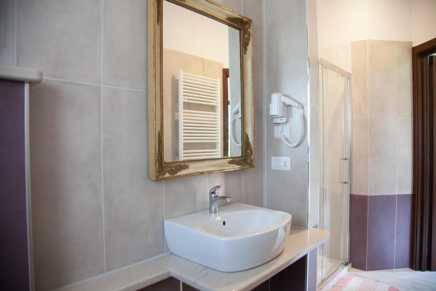 Camera Tripla Standard. Providing free toiletries and bathrobes, this triple room includes a private bathroom with a walk-in shower, a bidet and a hairdryer. The air-conditioned triple room provides a flat-screen TV with satellite channels, a private entrance, soundproof walls, a minibar as well as garden views.