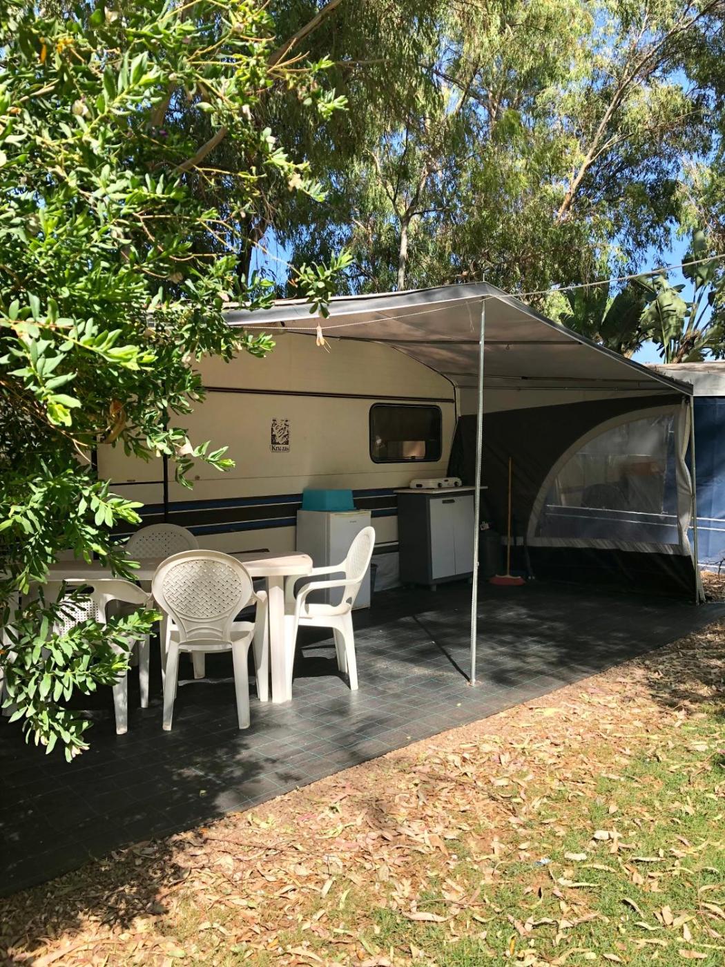 Caravan con Bagno in Comune. Roulotte con angolo cottura munito di frigorifero e utensili da cucina. Il bagno è in comune.