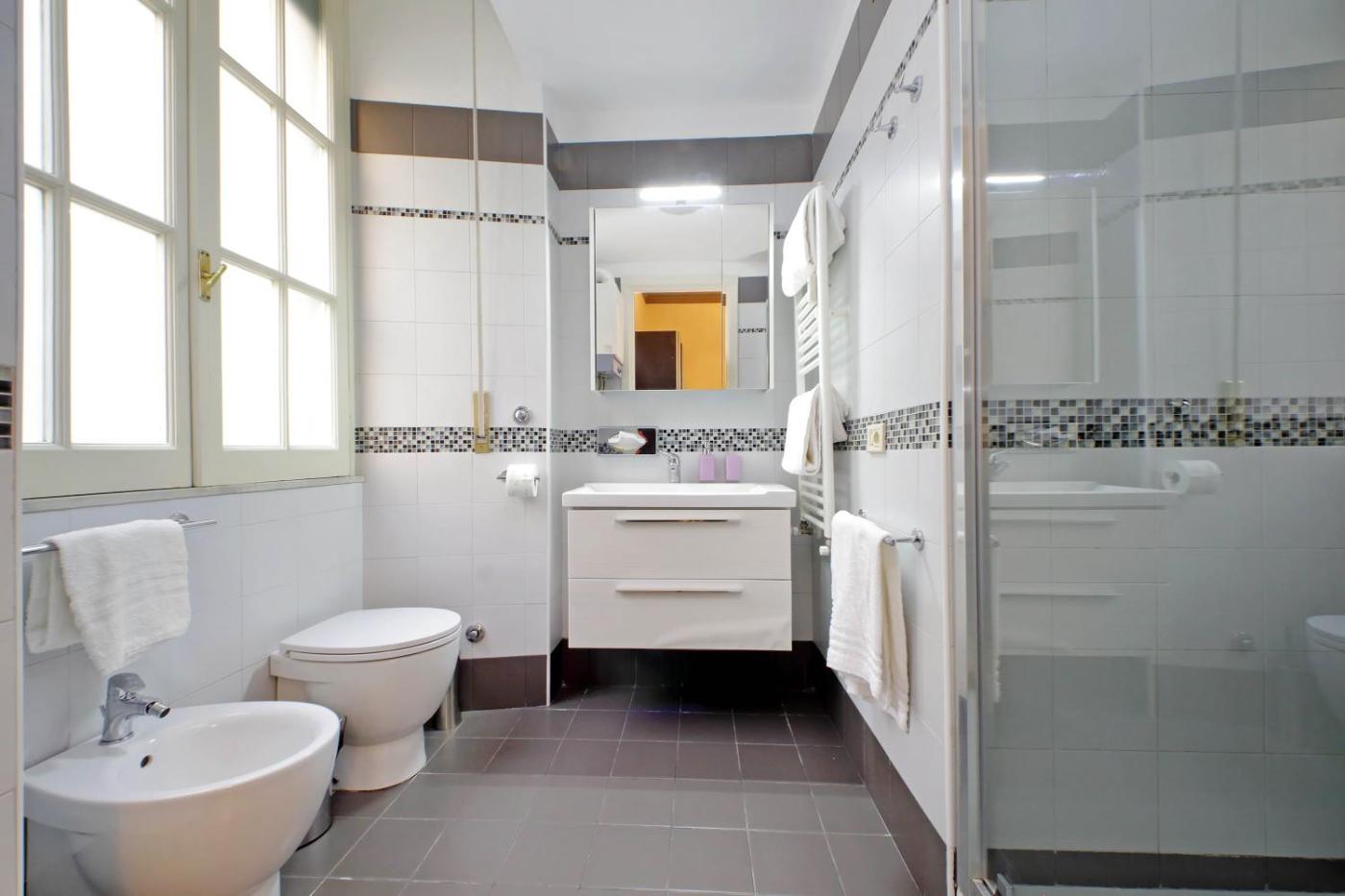 Questo appartamento con 3 camere da letto e aria condizionata presenta 2 bagni con bidet, doccia edi cortesia. La cucina prevede frigorifero, forno e microonde, più macchina da caffè e bollitore elettrico.