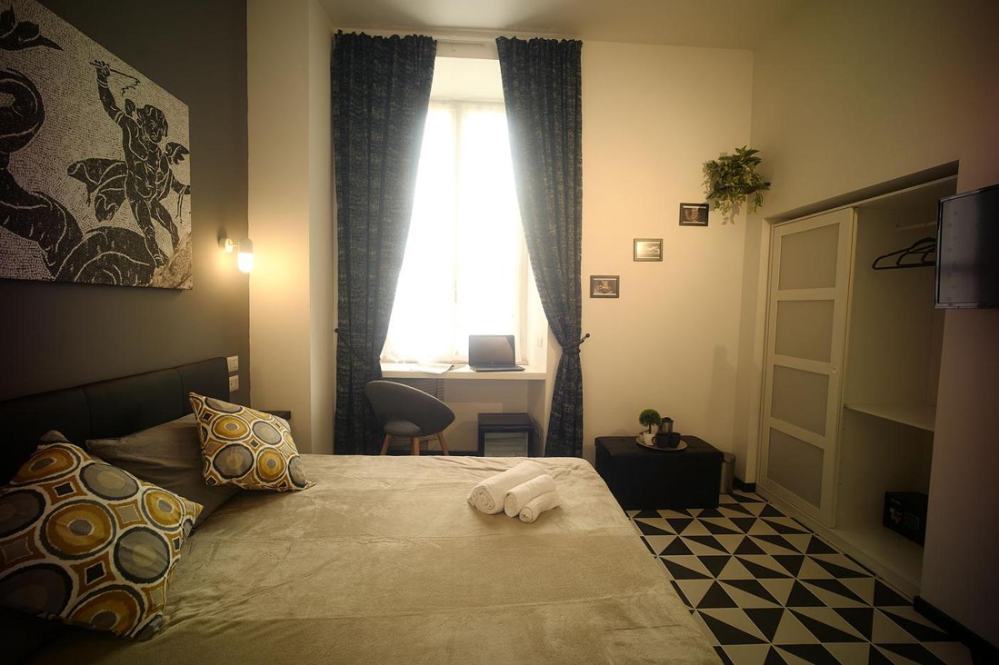 Camera Quadrupla Luxury. Camera quadrupla dotata di bagno privato con doccia, bidet, asciugacapelli edi cortesia. Inoltre dispone di aria condizionata, TV a schermo piatto con servizi di streaming, pareti insonorizzate, minibar,per la preparazione di tè e caffè e vista sulla città . L’alloggio presenta 3 letti. ;