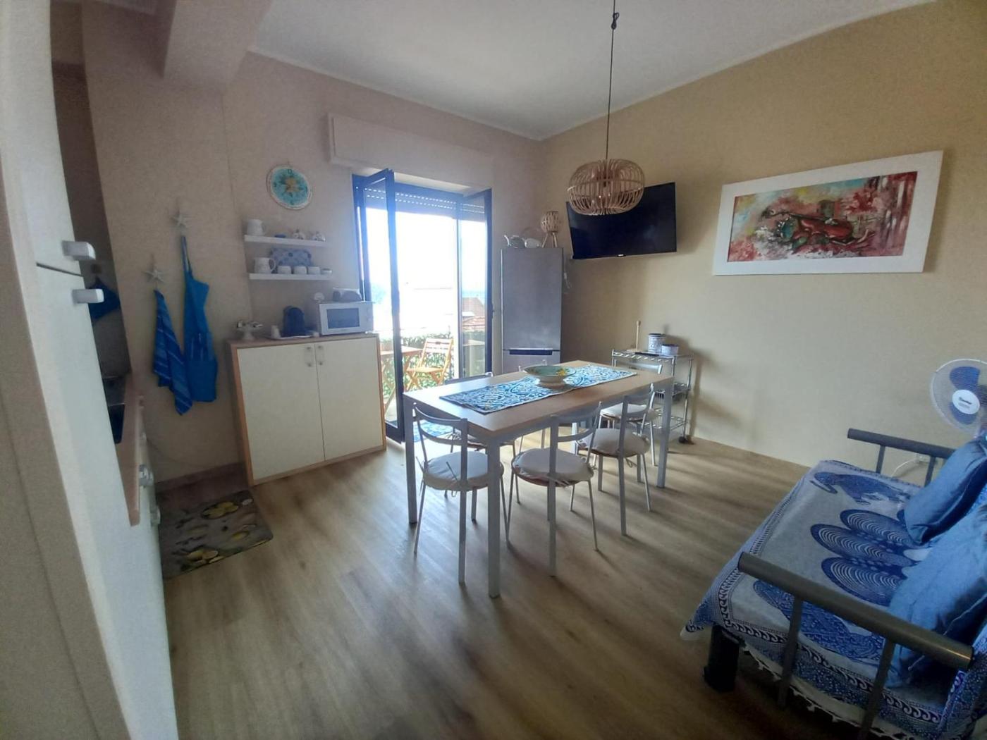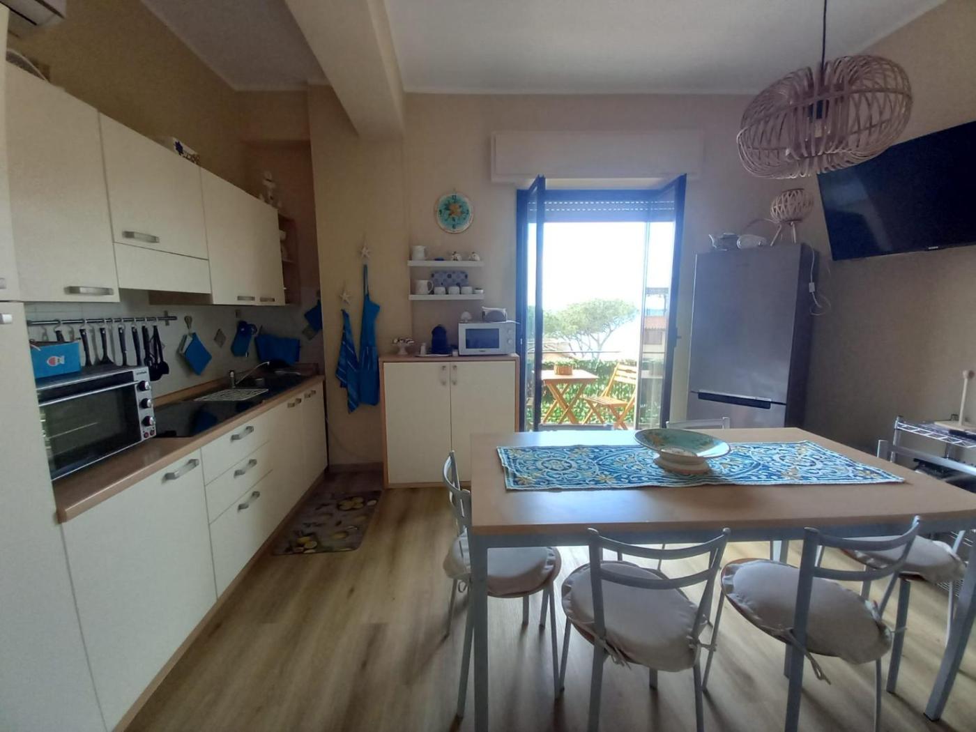 Appartamento con 1 Camera da Letto. This air-conditioned apartment comprises 1 living room, 1 separate bedroom and 1 bathroom with a shower. The well-equipped kitchen has a stovetop, a refrigerator, kitchenware and an oven. The apartment features parquet floors, a seating area with a flat-screen TV, a washing machine, a tea and coffee maker as well as sea views. The unit offers 3 beds.