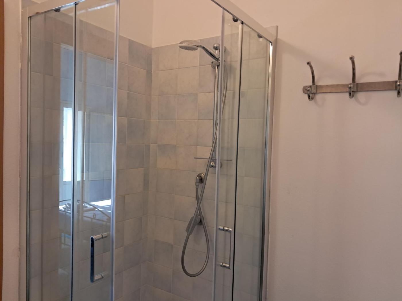 Camera Matrimoniale con Bagno Privato. Spaziosa camera matrimoniale climatizzata dotata di terrazza con vista sul cortile interno, minibar e bagno privato con doccia. L’alloggio dispone di 1 letto. ;